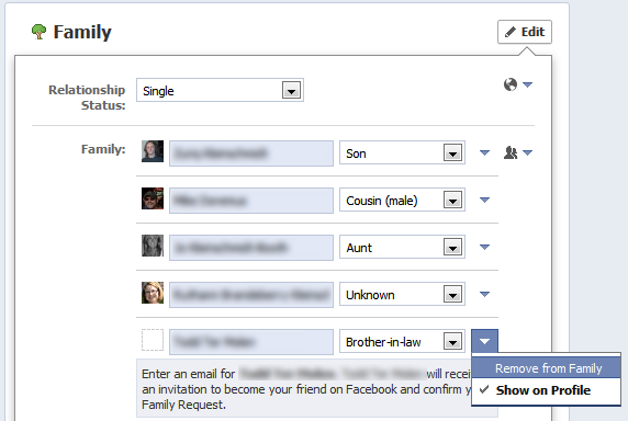 ![]() This screen will appear, and you can then select your family members. (and your relationship status) ![]() If you are trying to hide or remove a family member, you can find that option here ![]() |